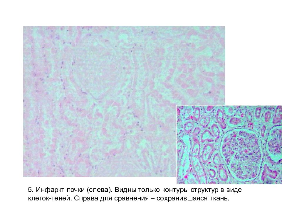 5. Инфаркт почки (слева). Видны только контуры структур в виде клеток-теней. Справа для сравнения – сохранившаяся ткань.