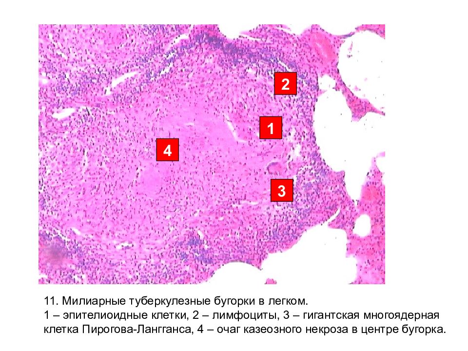 1 2 3 4 11. Милиарные туберкулезные бугорки в легком. 1 – эпителиоидные клетки, 2 – лимфоциты, 3 – гигантская многоядерная клетка Пирогова-Лангганса, 4 – очаг казеозного некроза в центре бугорка.