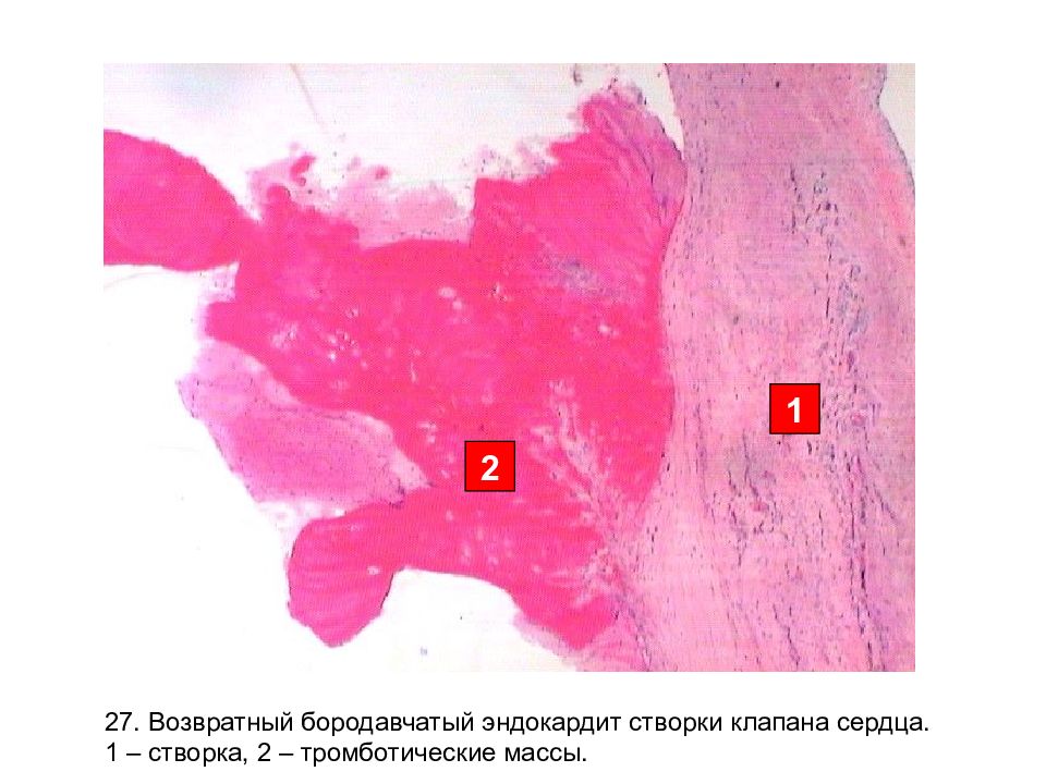 27. Возвратный бородавчатый эндокардит створки клапана сердца. 1 – створка, 2 – тромботические массы. 2 1