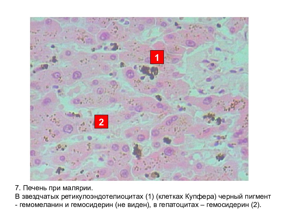 1 2 7. Печень при малярии. В звездчатых ретикулоэндотелиоцитах (1) (клетках Купфера) черный пигмент - гемомеланин и гемосидерин (не виден), в гепатоцитах – гемосидерин (2).