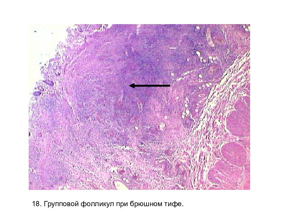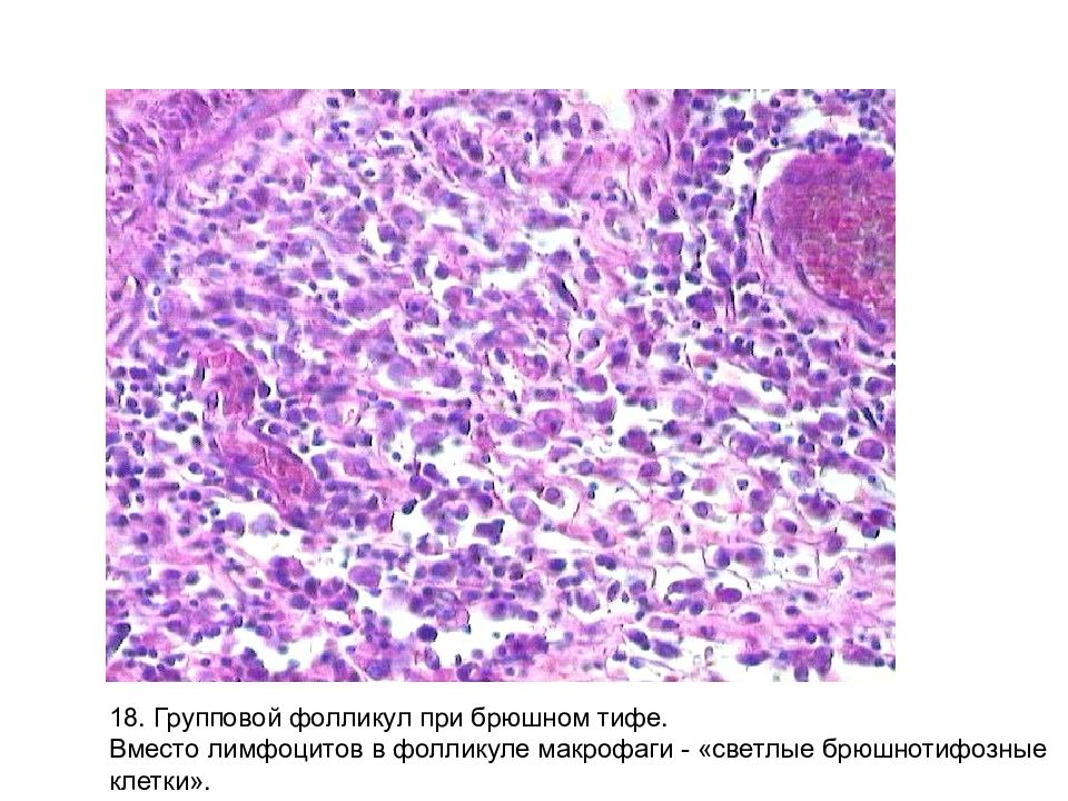 18. Групповой фолликул при брюшном тифе. Вместо лимфоцитов в фолликуле макрофаги - «светлые брюшнотифозные клетки».