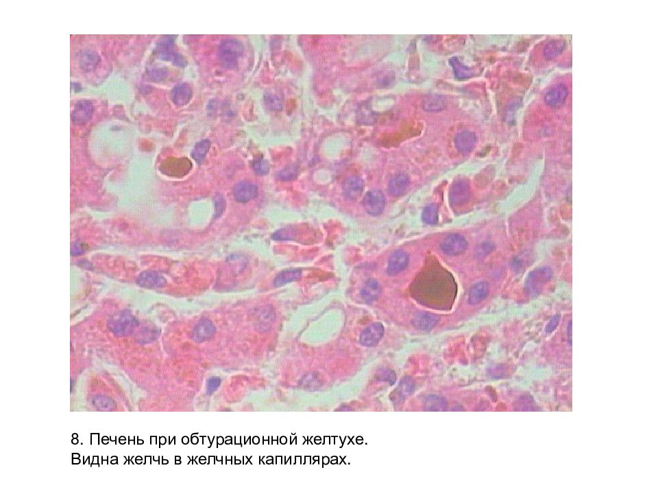 8. Печень при обтурационной желтухе. Видна желчь в желчных проточках (имеющих свою эпителиальную выстилку.