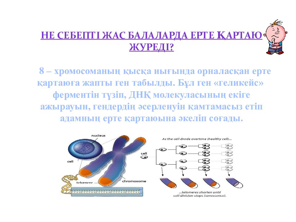 Не себепті жас балаларда ерте қартаю журеді? 8 – хромосоманың қысқа иығында орналасқан ерте қартаюға жапты ген табылды. Бұл ген «геликейс» ферментін түзіп, ДНҚ молекуласының екіге ажырауын, гендердің әсерленуін қамтамасыз етіп адамның ерте қартаюына әкеліп соғады.