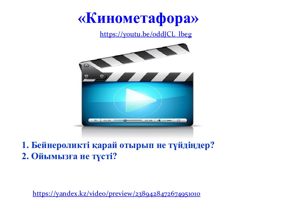 «Кинометафора» https://yandex.kz/video/preview/2389428472674951010 https://youtu.be/oddJCL_lbeg 1. Бейнероликті қарай отырып не түйдіңдер? 2. Ойымызға не түсті?