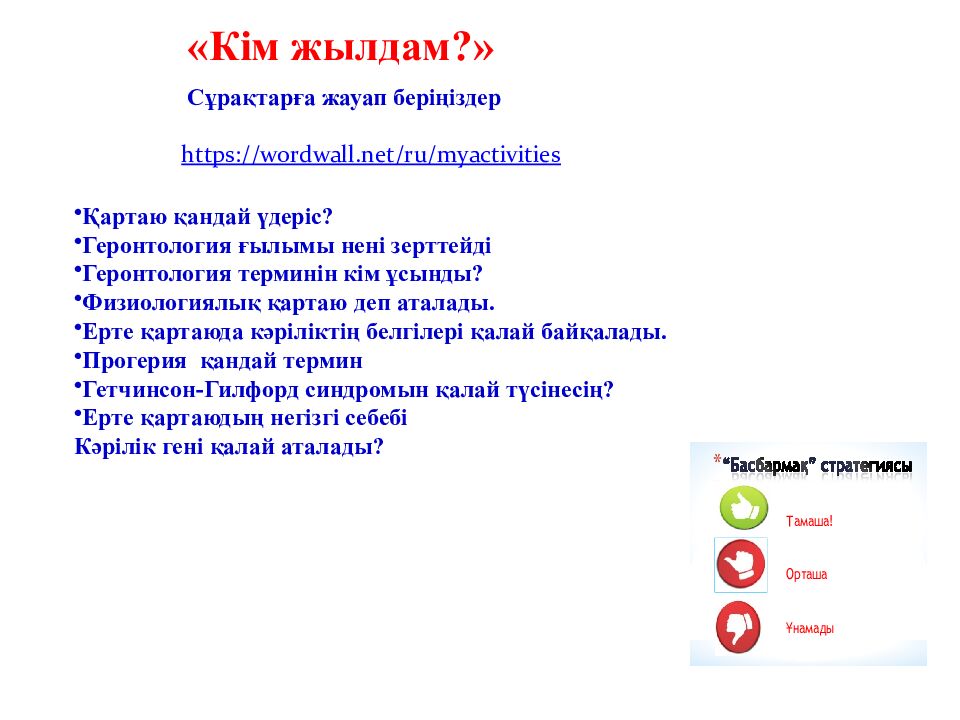 «Кім жылдам?» Сұрақтарға жауап беріңіздер https://wordwall.net/ru/myactivities Қартаю қандай үдеріс? Геронтология ғылымы нені зерттейді Геронтология терминін кім ұсынды ? Физиологиялық қартаю деп аталады. Ерте қартаюда кәріліктің белгілері қалай байқалады. Прогерия қандай термин Гетчинсон-Гилфорд синдромын қалай түсінесің? Ерте қартаюдың негізгі себебі Кәрілік гені қалай аталады ?