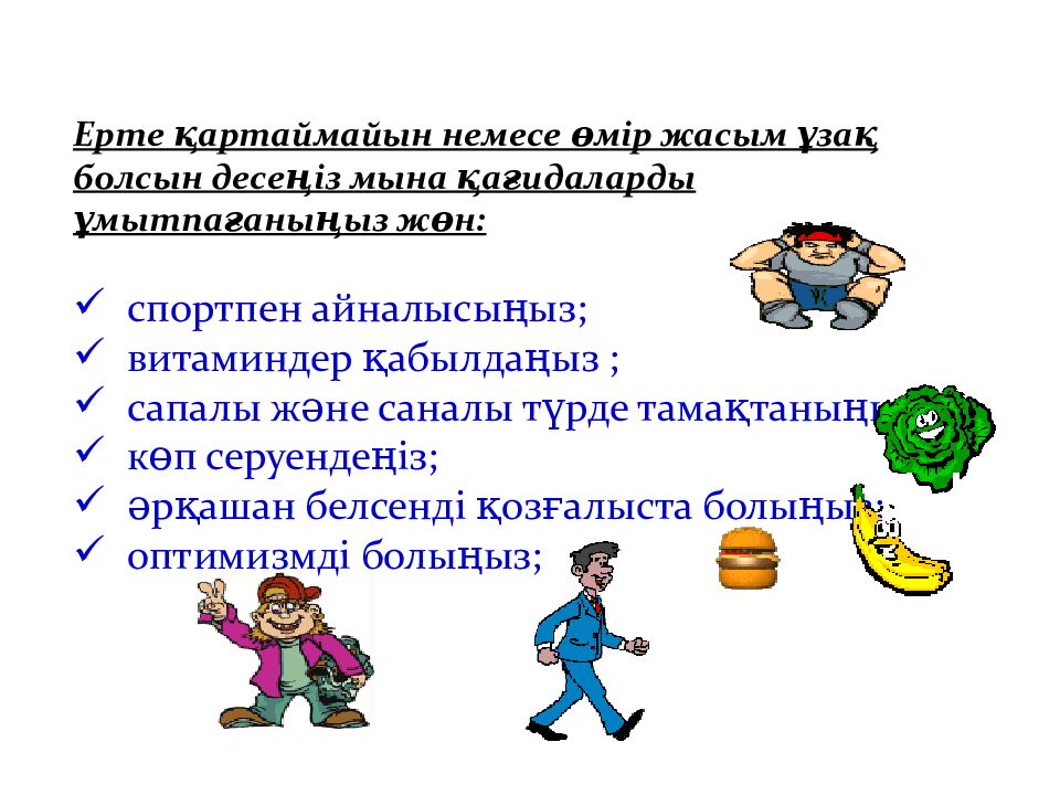 Ерте қартаймайын немесе өмір жасым ұзақ болсын десеңіз мына қағидаларды ұмытпағаныңыз жөн : спортпен айналысыңыз ; витаминдер қабылдаңыз ; сапалы және саналы түрде тамақтаныңыз ; көп серуендеңіз; әрқашан белсенді қозғалыста болыңыз ; оптимизмді болыңыз ;