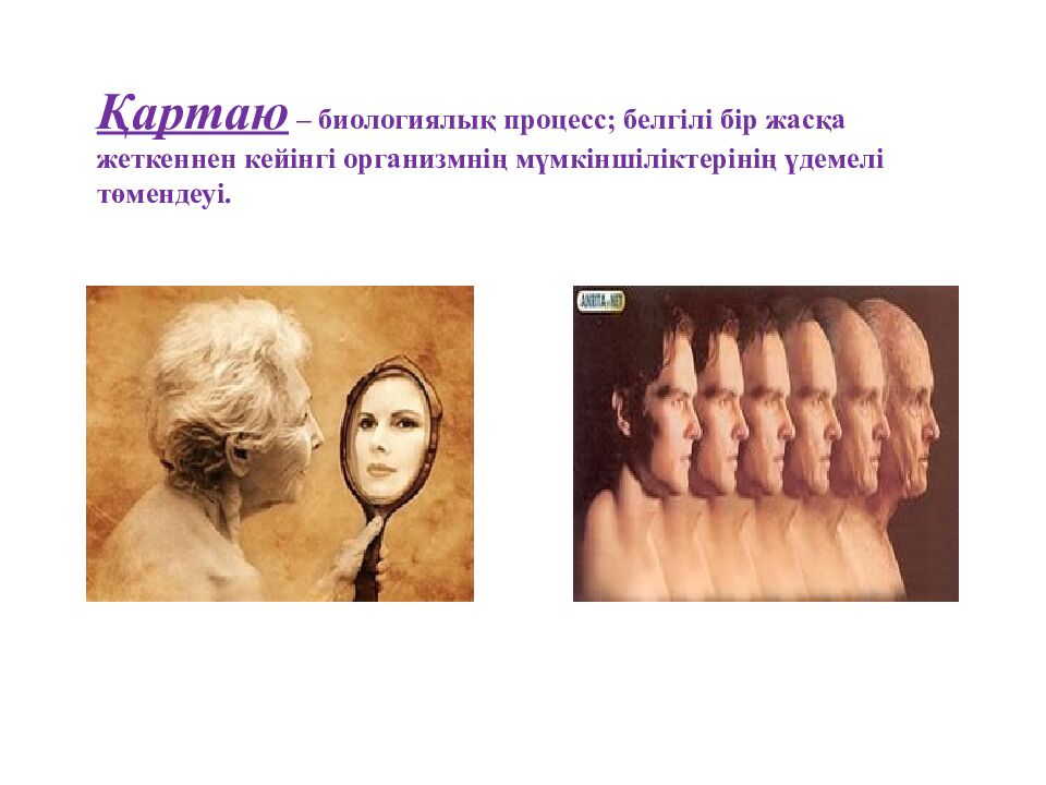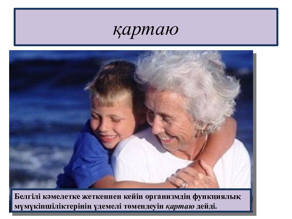 Қартаю – биологиялық процесс; белгілі бір жасқа жеткеннен кейінгі организмнің мүмкіншіліктерінің үдемелі төмендеуі.