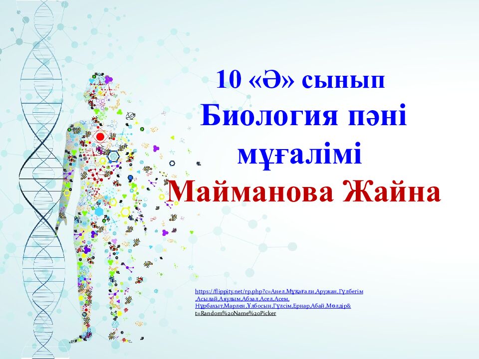 10 «Ә» сынып Биология пәні мұғалімі Майманова Жайна https://flippity.net/rp.php?c= Анел, Мұқағали,Аружан, Гүлбегім,Асылай,Аяулым,Абзал,Асел,Асем, Нұрбахыт,Марлен,Ұлбосын,Гүлсім,Ернар,Абай,Мөлдір& t=Random%20Name%20Picker