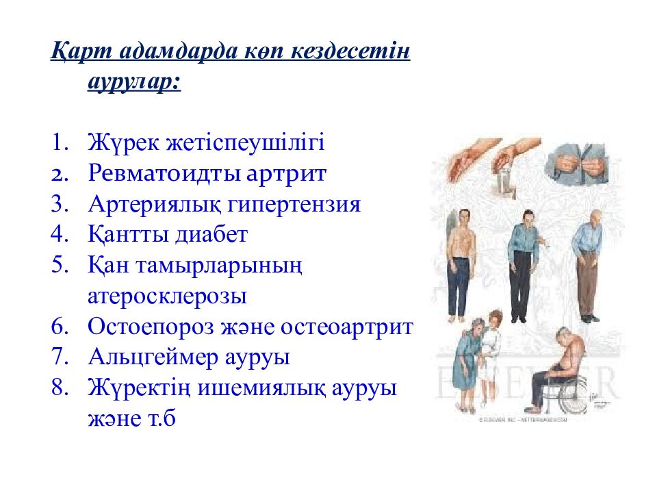 Қарт адамдарда көп кездесетін аурулар: Жүрек жетіспеушілігі Р евматоидты артрит Артериялық гипертензия Қантты диабет Қан тамырларының атеросклерозы Остоепороз және остеоартрит Альцгеймер ауруы Жүректің ишемиялық ауруы және т.б