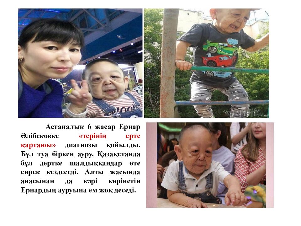 Астаналық 6 жасар Ернар Әлібековке « терінің ерте қартаюы » диагнозы қойылды. Бұл туа біркен ауру. Қазақстанда бұл дертке шалдыққандар өте сирек кездеседі. Алты жасында анасынан да кәрі көрінетін Ернардың ауруына ем жоқ деседі.