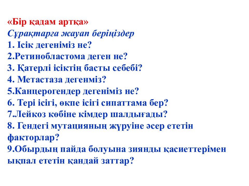 «Бір қадам артқа» Сұрақтарға жауап беріңіздер 1. Ісік дегеніміз не? 2.Ретинобластома деген не? 3. Қатерлі ісіктің басты себебі? 4. Метастаза дегенміз? 5.Канцерогендер дегеніміз не? 6. Тері ісігі, өкпе ісігі сипаттама бер? 7.Лейкоз көбіне кімдер шалдығады? 8. Гендегі мутацияның жүруіне әсер ететін факторлар? 9.Обырдың пайда болуына зиянды қасиеттерімен ықпал ететін қандай заттар?