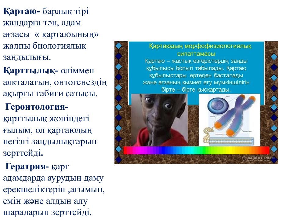 Қартаю - барлық тірі жандарға тән, адам ағзасы « қартаюының » жалпы биологиялық заңдылығы. Қарттылық- өліммен аяқталатын, онтогенездің ақырғы табиғи сатысы. Геронтология- қарттылық жөніндегі ғылым, ол қартаюдың негізгі заңдылықтарын зерттейді. Гератрия - қарт адамдарда аурудың даму ерекшеліктерін, ағымын, емін және алдын алу шараларын зерттейді.