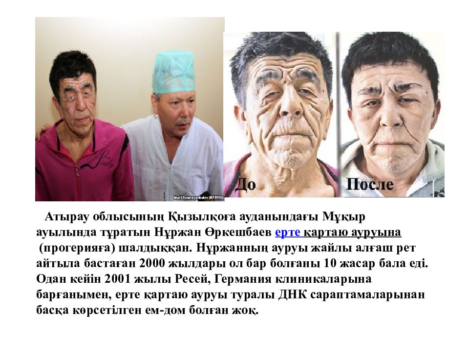 Атырау облысының Қызылқоға ауданындағы Мұқыр ауылында тұратын Нұржан Өркешбаев ерте қартаю ауруына ( прогерияға ) шалдыққан. Нұржанның ауруы жайлы алғаш рет айтыла бастаған 2000 жылдары ол бар болғаны 10 жасар бала еді. Одан кейін 2001 жылы Ресей, Германия клиникаларына барғанымен, ерте қартаю ауруы туралы ДНК сараптамаларынан басқа көрсетілген ем-дом болған жоқ.