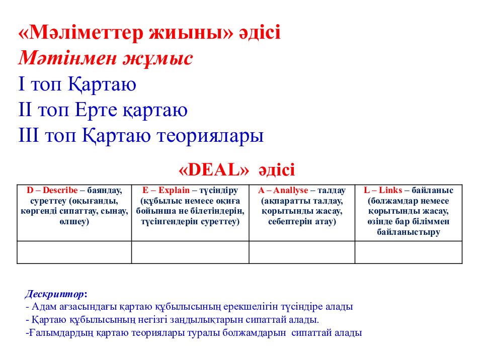 «Мәліметтер жиыны» әдісі Мәтінмен жұмыс І топ Қартаю ІІ топ Ерте қартаю ІІІ топ Қартаю теориялары D – Describe – баяндау, суреттеу (оқығанды, көргенді сипаттау, сынау, өлшеу) E – Explain – түсіндіру (құбылыс немесе оқиға бойынша не білетіндерін, түсінгендерін суреттеу) A – Anallуse – талдау (ақпаратты талдау, қорытынды жасау, себептерін атау) L – Links – байланыс (болжамдар немесе қорытынды жасау, өзінде бар біліммен байланыстыру «DEAL» әдісі Дескриптор : - Адам ағзасындағы қартаю құбылысының ерекшелігін түсіндіре алады - Қартаю құбылысының негізгі заңдылықтарын сипаттай алады. -Ғалымдардың қартаю теориялары туралы болжамдарын сипаттай алады