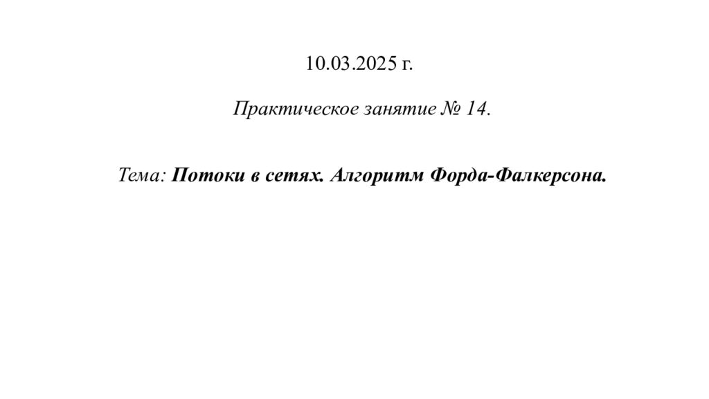 Первый слайд презентации: 10.03.2025 г. Практическое занятие № 14. Тема: Потоки в сетях. Алгоритм Форда-Фалкерсона