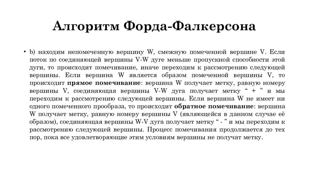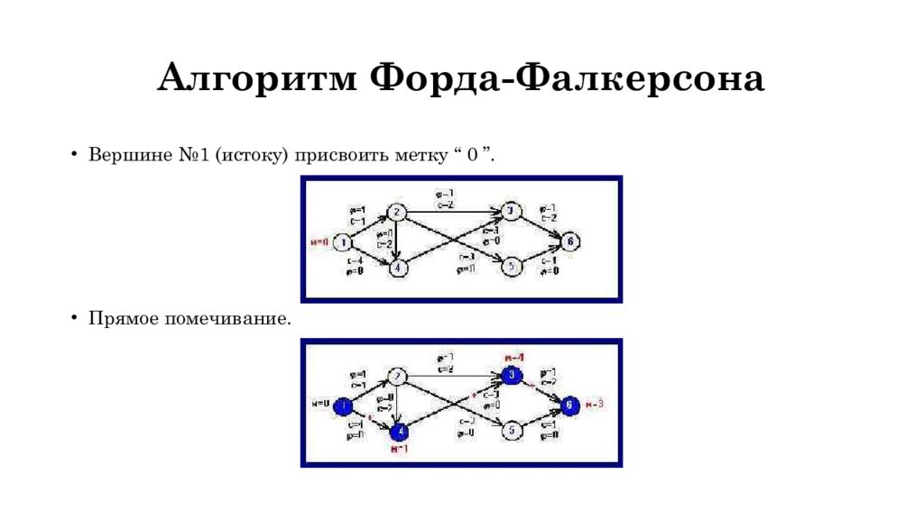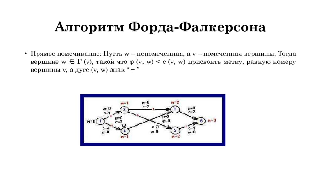 Прямое помечивание : Пусть w – непомеченная, а v – помеченная вершины. Тогда вершине w ∈ Г ( v ), такой что φ ( v, w ) < c (v, w) присвоить метку, равную номеру вершины v, а дуге ( v, w ) знак “ + ”
