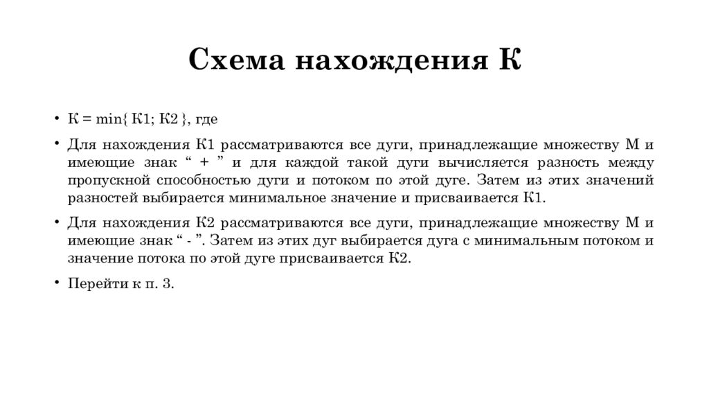 К = min { К1 ; К2 }, где Для нахождения К1 рассматриваются все дуги, принадлежащие множеству М и имеющие знак “ + ” и для каждой такой дуги вычисляется разность между пропускной способностью дуги и потоком по этой дуге. Затем из этих значений разностей выбирается минимальное значение и присваивается К1. Для нахождения К2 рассматриваются все дуги, принадлежащие множеству М и имеющие знак “ - ”. Затем из этих дуг выбирается дуга с минимальным потоком и значение потока по этой дуге присваивается К2. Перейти к п. 3.