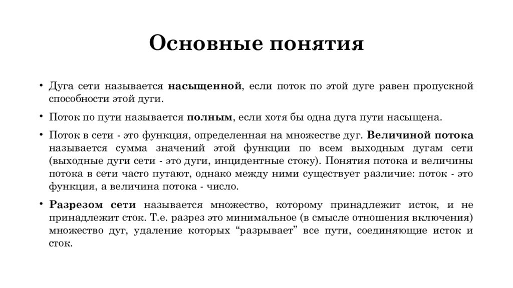 Дуга сети называется насыщенной, если поток по этой дуге равен пропускной способности этой дуги. Поток по пути называется полным, если хотя бы одна дуга пути насыщена. Поток в сети - это функция, определенная на множестве дуг. Величиной потока называется сумма значений этой функции по всем выходным дугам сети (выходные дуги сети - это дуги, инцидентные стоку). Понятия потока и величины потока в сети часто путают, однако между ними существует различие: поток - это функция, а величина потока - число. Разрезом сети называется множество, которому принадлежит исток, и не принадлежит сток. Т.е. разрез это минимальное (в смысле отношения включения) множество дуг, удаление которых “разрывает ” все пути, соединяющие исток и сток.