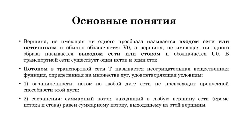 Вершина, не имеющая ни одного прообраза называется входом сети или источником и обычно обозначается V0, а вершина, не имеющая ни одного образа называется выходом сети или стоком и обозначается U0. В транспортной сети существует один исток и один сток. Потоком в транспортной сети Т называется неотрицательная вещественная функция, определенная на множестве дуг, удовлетворяющая условиям: 1 ) ограниченности: поток по любой дуге сети не превосходит пропускной способности этой дуги; 2 ) сохранения: суммарный поток, заходящий в любую вершину сети (кроме истока и стока) равен суммарному потоку, выходящему из этой вершины.