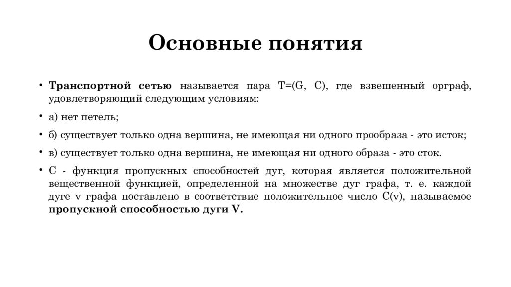 Транспортной сетью называется пара Т=( G, C), где взвешенный орграф, удовлетворяющий следующим условиям: а ) нет петель; б ) существует только одна вершина, не имеющая ни одного прообраза - это исток; в ) существует только одна вершина, не имеющая ни одного образа - это сток. С - функция пропускных способностей дуг, которая является положительной вещественной функцией, определенной на множестве дуг графа, т. е. каждой дуге v графа поставлено в соответствие положительное число С(v), называемое пропускной способностью дуги V.