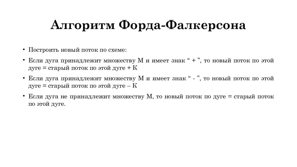Построить новый поток по схеме: Если дуга принадлежит множеству М и имеет знак “ + ”, то новый поток по этой дуге = старый поток по этой дуге + К Если дуга принадлежит множеству М и имеет знак “ - ”, то новый поток по этой дуге = старый поток по этой дуге – К Если дуга не принадлежит множеству М, то новый поток по дуге = старый поток по этой дуге.