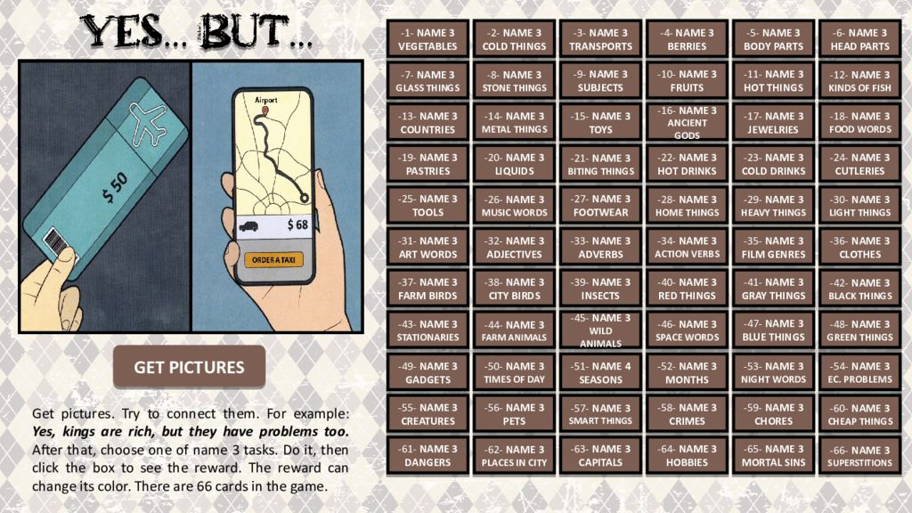$10 $30 $70 $100 $50 $10 $20 $20 $10 $90 $40 $20 $30 $30 $40 $80 $20 $30 $90 $20 $40 $40 $10 $40 $100 $80 $50 $50 $10 $30 $40 $90 $70 $60 $60 $60 $80 $30 $80 $60 $70 $70 $40 $80 $20 $70 $50 $80 $50 $30 $70 $10 $60 $40 $10 $60 $20 $60 $100 $50 $30 $20 $70 $10 $50 $90 -1- Name 3 vegetables -2- Name 3 cold things -3- Name 3 transports -4- Name 3 berries -5- Name 3 body parts -6- Name 3 head parts -7- Name 3 glass things -8- Name 3 stone things -9- Name 3 subjects -10- Name 3 fruits -11- Name 3 hot things -12- Name 3 kinds of fish -13- Name 3 countries -14- Name 3 metal things -15- Name 3 toys -16- Name 3 ancient gods -17- Name 3 jewelries -18- Name 3 food words -19- Name 3 pastries -20- Name 3 liquids -21- Name 3 Biting things -22- Name 3 hot drinks -23- Name 3 cold drinks -24- Name 3 cutleries -25- Name 3 tools -26- Name 3 music words -27- Name 3 footwear -28- Name 3 home things -29- Name 3 heavy things -30- Name 3 light things -31- Name 3 Art words -32- Name 3 adjectives -33- Name 3 adverbs -34- Name 3 action verbs -35- Name 3 film genres -36- Name 3 clothes -37- Name 3 farm birds -38- Name 3 city birds -39- Name 3 insects -40- Name 3 red things -41- Name 3 gray things -42- Name 3 black things -43- Name 3 stationaries -44- Name 3 farm animals -45- Name 3 wild animals -46- Name 3 space words -47- Name 3 blue things -48- Name 3 green things -49- Name 3 gadgets -50- Name 3 times of day -51- Name 4 seasons -52- Name 3 months -53- Name 3 night words -54- Name 3 Ec. problems -55- Name 3 creatures -56- Name 3 pets -57- Name 3 smart things -58- Name 3 crimes -59- Name 3 chores -60- Name 3 cheap things -61- Name 3 dangers -62- Name 3 places in city -63- Name 3 capitals -64- Name 3 hobbies -65- Name 3 mortal sins -66- Name 3 Superstitions GET PICTURES Get pictures. Try to connect them. For example: Yes, kings are rich, but they have problems too. After that, choose one of name 3 tasks. Do it, then click the box to see the reward. The reward can change its color. There are 66 cards in the game.