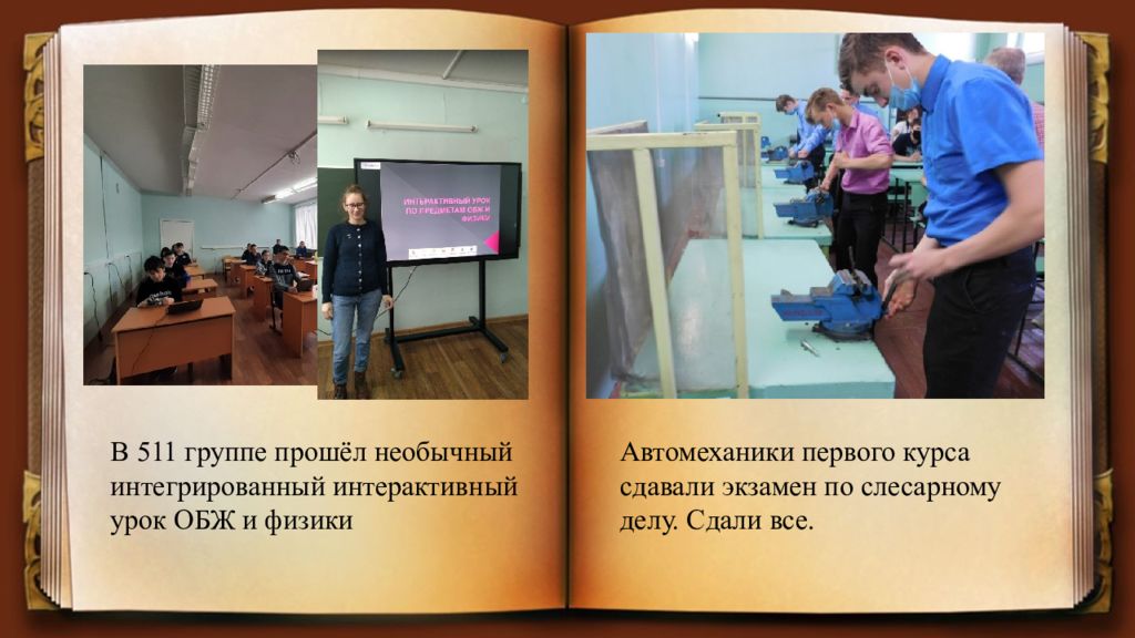 В 511 группе прошёл необычный интегрированный интерактивный урок ОБЖ и физики Автомеханики первого курса сдавали экзамен по слесарному делу. Сдали все.