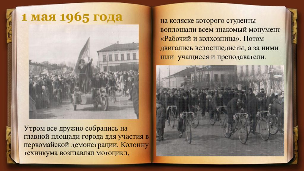 Утром все дружно собрались на главной площади города для участия в первомайской демонстрации. Колонну техникума возглавлял мотоцикл, 1 мая 1965 года на коляске которого студенты воплощали всем знакомый монумент «Рабочий и колхозница». Потом двигались велосипедисты, а за ними шли учащиеся и преподаватели.