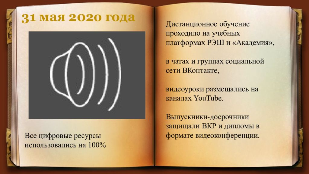 Дистанционное обучение проходило на у чебных платформах РЭШ и «Академия», в чатах и группах социальной сети ВКонтакте, видеоуроки размещались на каналах YouTube. Выпускники- досрочники защищали ВКР и дипломы в формате видеоконференции. Все цифровые ресурсы использовались на 100%