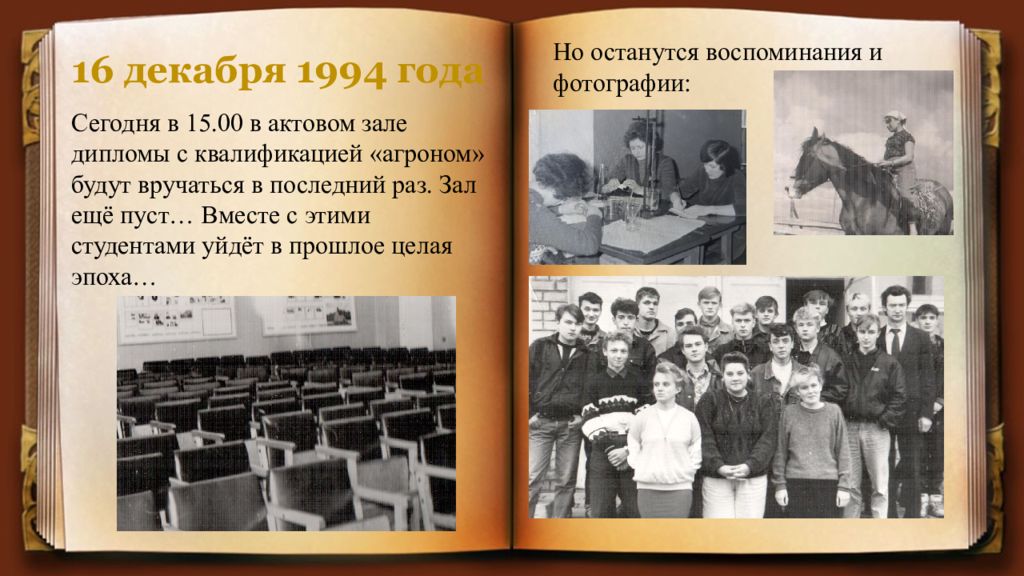 Но останутся воспоминания и фотографии: Сегодня в 15.00 в актовом зале дипломы с квалификацией «агроном» будут вручаться в последний раз. Зал ещё пуст… Вместе с этими студентами уйдёт в прошлое целая эпоха…