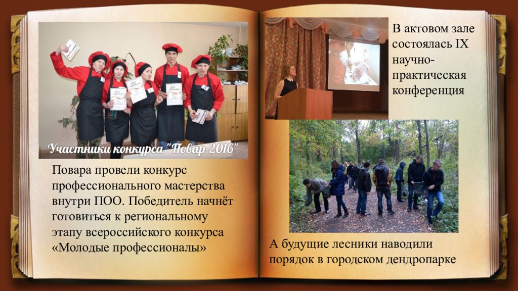 Повара провели конкурс профессионального мастерства внутри ПОО. Победитель начнёт готовиться к региональному этапу всероссийского конкурса «Молодые профессионалы» В актовом зале состоялась IX научно-практическая конференция А будущие лесники наводили порядок в городском дендропарке