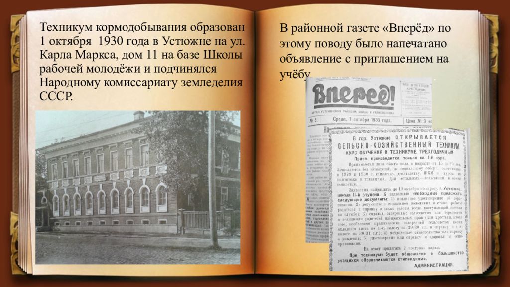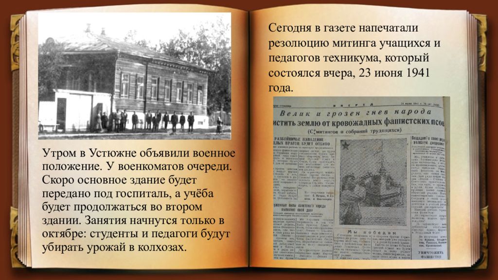 Утром в Устюжне объявили военное положение. У военкоматов очереди. Скоро основное здание будет передано под госпиталь, а учёба будет продолжаться во втором здании. Занятия начнутся только в октябре: студенты и педагоги будут убирать урожай в колхозах. Сегодня в газете напечатали резолюцию митинга учащихся и педагогов техникума, который состоялся вчера, 23 июня 1941 года.