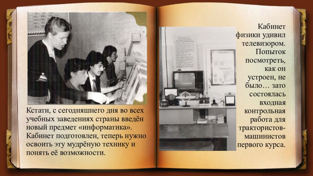 Кстати, с сегодняшнего дня во всех учебных заведениях страны введён новый предмет «информатика». Кабинет подготовлен, теперь нужно освоить эту мудрёную технику и понять её возможности. Кабинет физики удивил телевизором. Попыток посмотреть, как он устроен, не было… зато состоялась входная контрольная работа для трактористов-машинистов первого курса.