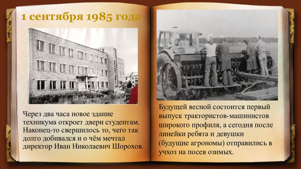 Будущей весной состоится первый выпуск трактористов-машинистов широкого профиля, а сегодня после линейки ребята и девушки (будущие агрономы) отправились в учхоз на посев озимых. Через два часа новое здание техникума откроет двери студентам. Наконец-то свершилось то, чего так долго добивался и о чём мечтал директор Иван Николаевич Шорохов.