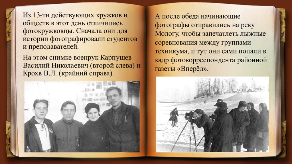 Из 13-ти действующих кружков и обществ в этот день отличились фотокружковцы. Сначала они для истории фотографировали студентов и преподавателей. На этом снимке военрук Карпушев Василий Николаевич (второй слева) и Крохв В.Л. ( крайний справа ). А после обеда начинающие фотографы отправились на реку Мологу, чтобы запечатлеть лыжные соревнования между группами техникума, и тут они сами попали в кадр фотокорреспондента районной газеты «Вперёд».