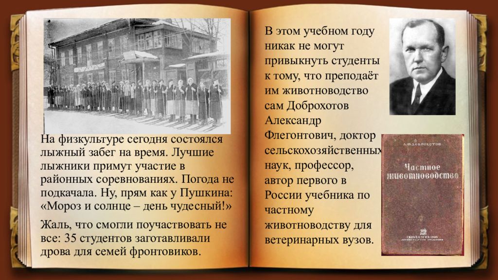 На физкультуре сегодня состоялся лыжный забег на время. Лучшие лыжники примут участие в районных соревнованиях. Погода не подкачала. Ну, прям как у Пушкина: «Мороз и солнце – день чудесный!» Жаль, что смогли поучаствовать не все: 35 студентов заготавливали дрова для семей фронтовиков. В этом учебном году никак не могут привыкнуть студенты к тому, что преподаёт им животноводство сам Доброхотов Александр Флегонтович, доктор сельскохозяйственных наук, профессор, автор первого в России учебника по частному животноводству для ветеринарных вузов.