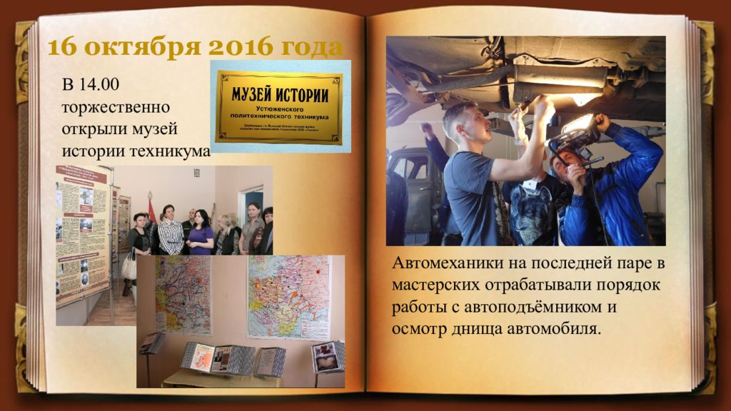 Автомеханики на последней паре в мастерских отрабатывали порядок работы с автоподъёмником и осмотр днища автомобиля. В 14.00 торжественно открыли музей истории техникума