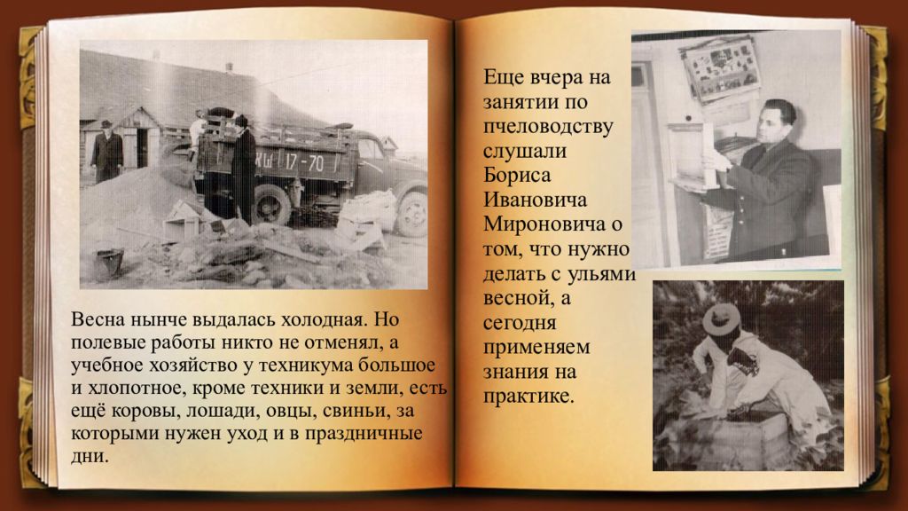 Весна нынче выдалась холодная. Но полевые работы никто не отменял, а учебное хозяйство у техникума большое и хлопотное, кроме техники и земли, есть ещё коровы, лошади, овцы, свиньи, за которыми нужен уход и в праздничные дни. Еще вчера на занятии по пчеловодству слушали Бориса Ивановича Мироновича о том, что нужно делать с ульями весной, а сегодня применяем знания на практике.