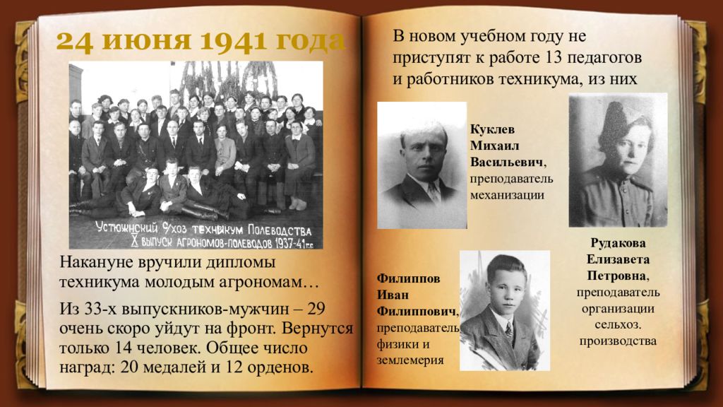 Накануне вручили дипломы техникума молодым агрономам… Из 33-х выпускников-мужчин – 29 очень скоро уйдут на фронт. Вернутся только 14 человек. Общее число наград: 20 медалей и 12 орденов. 24 июня 1941 года В новом учебном году не приступят к работе 13 педагогов и работников техникума, из них Рудакова Елизавета Петровна, преподаватель организации сельхоз. производства Филиппов Иван Филиппович, преподаватель физики и землемерия Куклев Михаил Васильевич, преподаватель механизации