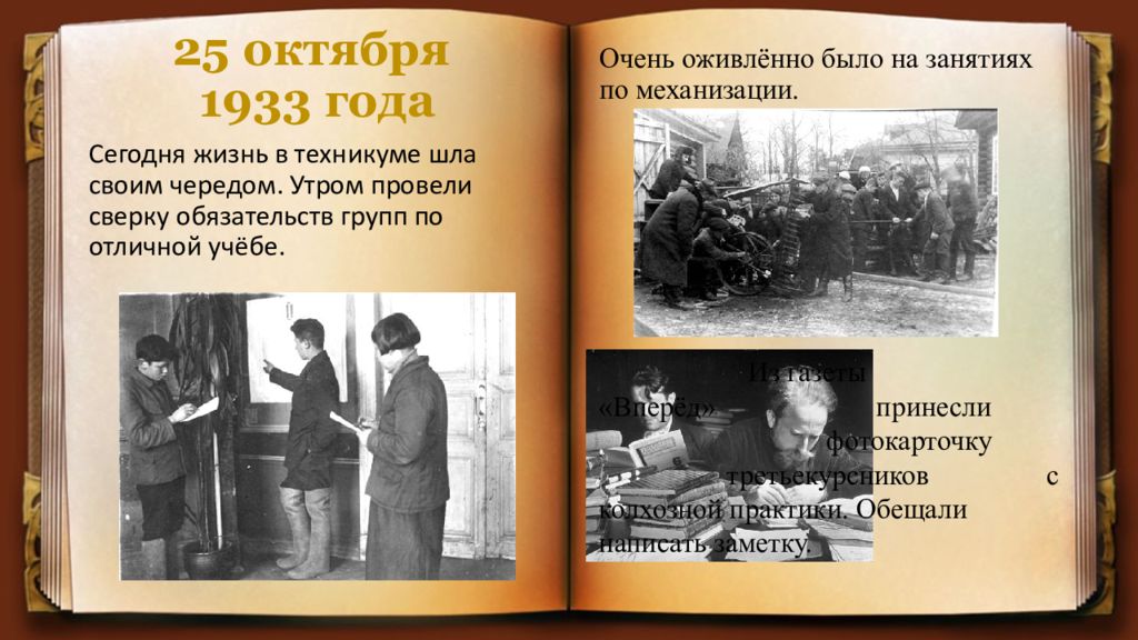 Сегодня жизнь в техникуме шла своим чередом. Утром провели сверку обязательств групп по отличной учёбе. Очень оживлённо было на занятиях по механизации. Из газеты « Вперёд» принесли фотокарточку третьекурсников с колхозной практики. Обещали написать заметку.