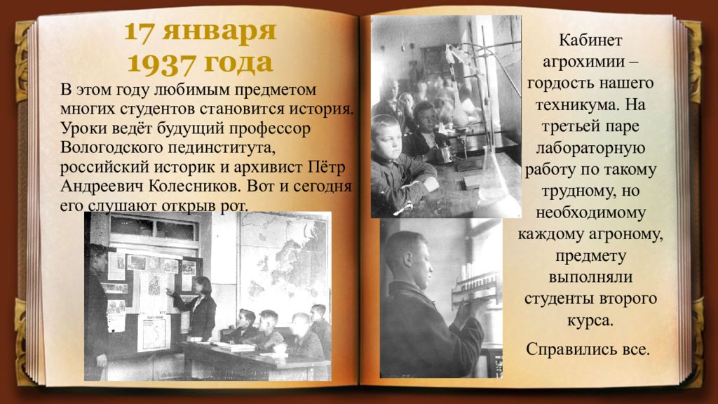 В этом году любимым предметом многих студентов становится история. Уроки ведёт будущий профессор Вологодского пединститута, российский историк и архивист Пётр Андреевич Колесников. Вот и сегодня его слушают открыв рот. Кабинет агрохимии – гордость нашего техникума. На третьей паре лабораторную работу по такому трудному, но необходимому каждому агроному, предмету выполняли студенты второго курса. Справились все.