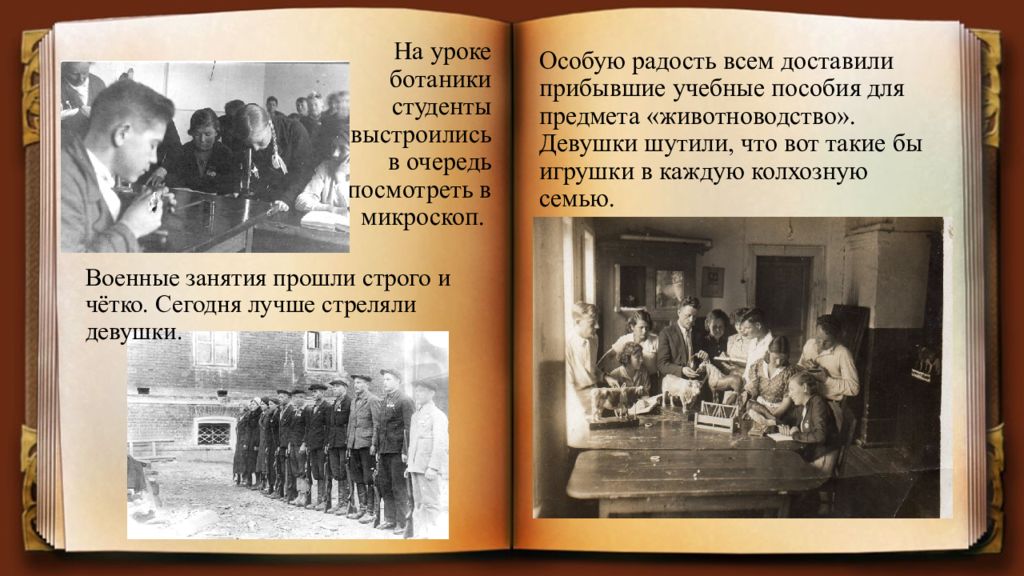 На уроке ботаники студенты выстроились в очередь посмотреть в микроскоп. Военные занятия прошли строго и чётко. Сегодня лучше стреляли девушки. Особую радость всем доставили прибывшие учебные пособия для предмета «животноводство». Девушки шутили, что вот такие бы игрушки в каждую колхозную семью.