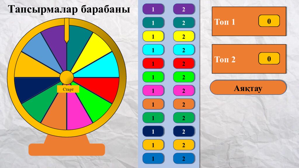 1 2 1 2 1 2 1 2 1 2 1 2 1 2 1 2 1 2 1 2 1 2 1 2 Старт Топ 1 24 23 22 21 20 19 18 17 16 15 14 13 12 11 10 9 8 7 6 5 4 3 2 1 0 Топ 2 24 23 22 21 20 19 18 17 16 15 14 13 12 11 10 9 8 7 6 5 4 3 2 1 0 Ая қтау Тапсырмалар барабаны