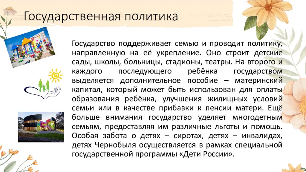 Государство поддерживает семью и проводит политику, направленную на её укрепление. Оно строит детские сады, школы, больницы, стадионы, театры. На второго и каждого последующего ребёнка государством выделяется дополнительное пособие – материнский капитал, который может быть использован для оплаты образования ребёнка, улучшения жилищных условий семьи или в качестве прибавки к пенсии матери. Ещё больше внимания государство уделяет многодетным семьям, предоставляя им различные льготы и помощь. Особая забота о детях – сиротах, детях – инвалидах, детях Чернобыля осуществляется в рамках специальной государственной программы «Дети России».