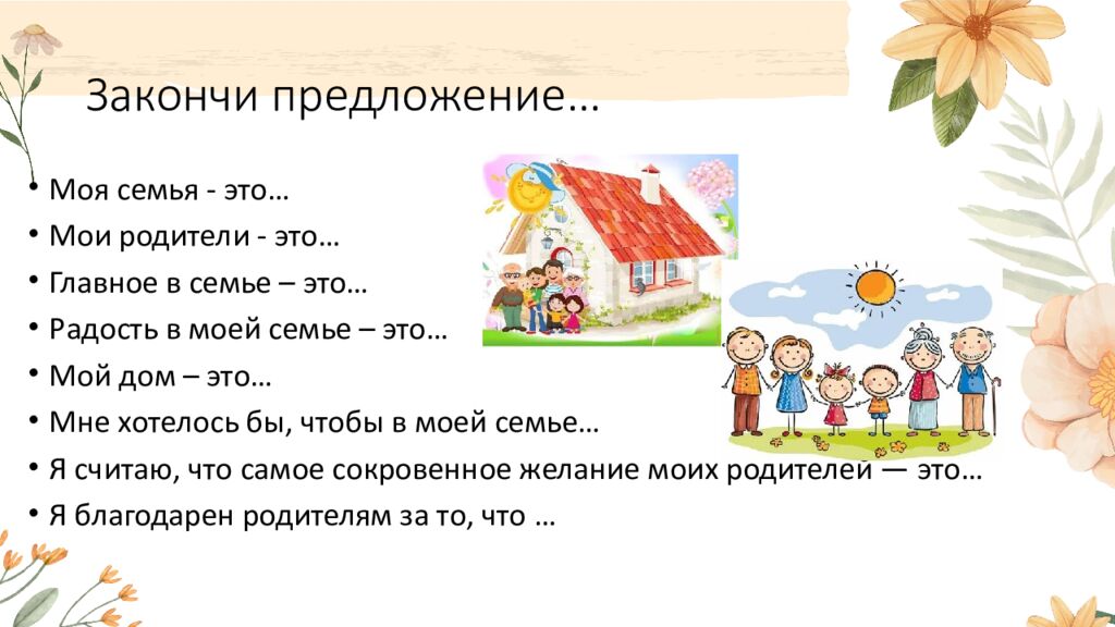 Моя семья - это… Мои родители - это… Главное в семье – это… Радость в моей семье – это… Мой дом – это… Мне хотелось бы, чтобы в моей семье… Я считаю, что самое сокровенное желание моих родителей — это… Я благодарен родителям за то, что …