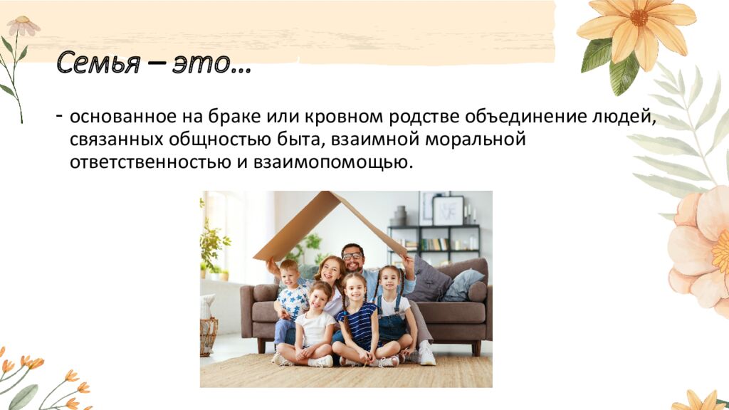 основанное на браке или кровном родстве объединение людей, связанных общностью быта, взаимной моральной ответственностью и взаимопомощью.