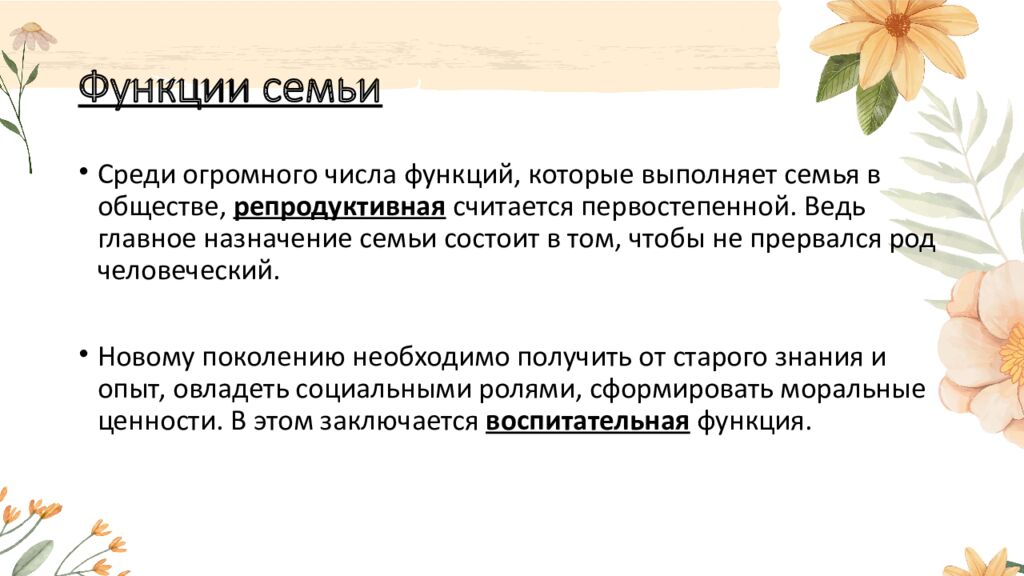 Среди огромного числа функций, которые выполняет семья в обществе, репродуктивная считается первостепенной. Ведь главное назначение семьи состоит в том, чтобы не прервался род человеческий. Новому поколению необходимо получить от старого знания и опыт, овладеть социальными ролями, сформировать моральные ценности. В этом заключается воспитательная функция.