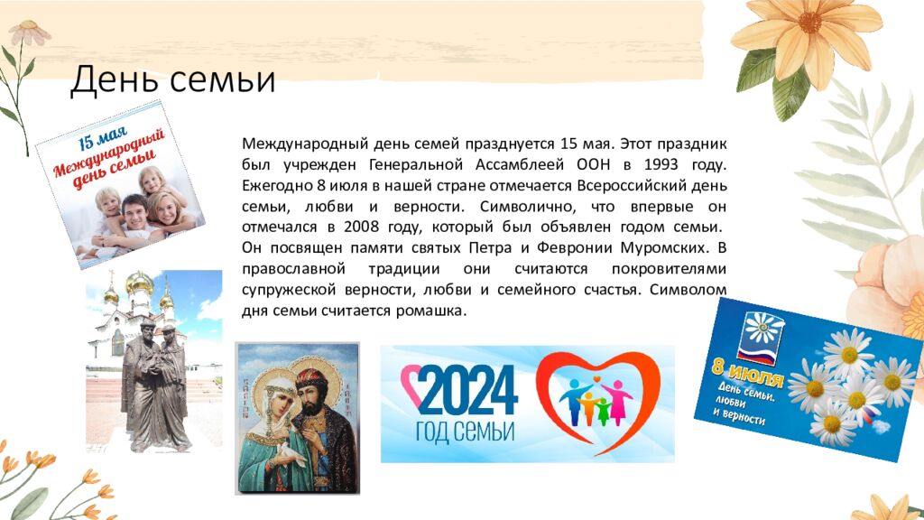 Международный день семей празднуется 15 мая. Этот праздник был учрежден Генеральной Ассамблеей ООН в 1993 году. Ежегодно 8 июля в нашей стране отмечается Всероссийский день семьи, любви и верности. Символично, что впервые он отмечался в 2008 году, который был объявлен годом семьи. Он посвящен памяти святых Петра и Февронии Муромских. В православной традиции они считаются покровителями супружеской верности, любви и семейного счастья. Символом дня семьи считается ромашка.