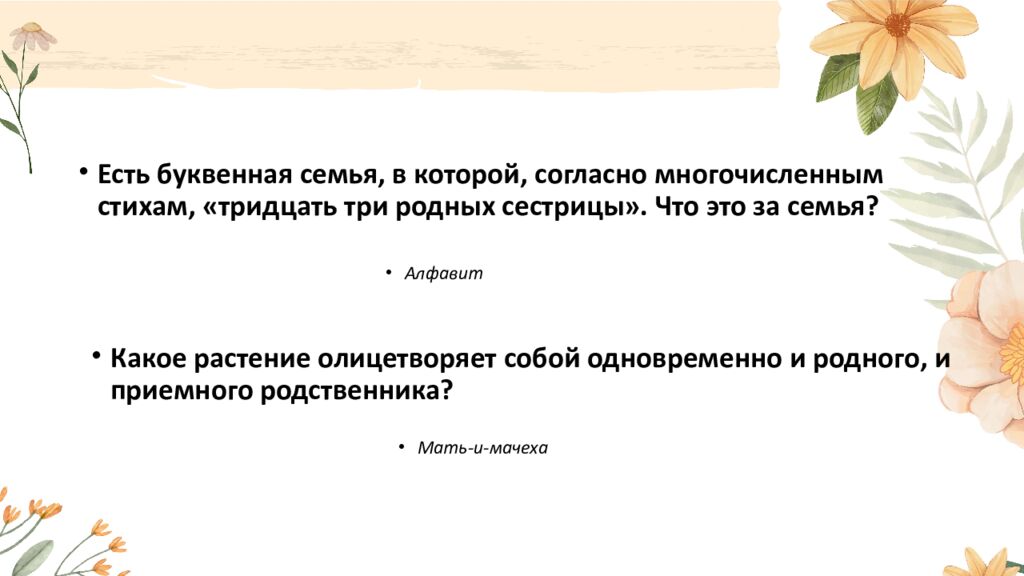 Есть буквенная семья, в которой, согласно многочисленным стихам, «тридцать три родных сестрицы». Что это за семья? Алфавит Какое растение олицетворяет собой одновременно и родного, и приемного родственника? Мать-и-мачеха