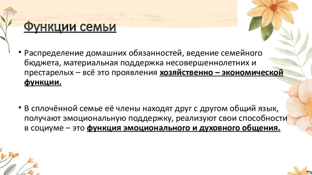 Распределение домашних обязанностей, ведение семейного бюджета, материальная поддержка несовершеннолетних и престарелых – всё это проявления хозяйственно – экономической функции. В сплочённой семье её члены находят друг с другом общий язык, получают эмоциональную поддержку, реализуют свои способности в социуме – это функция эмоционального и духовного общения.